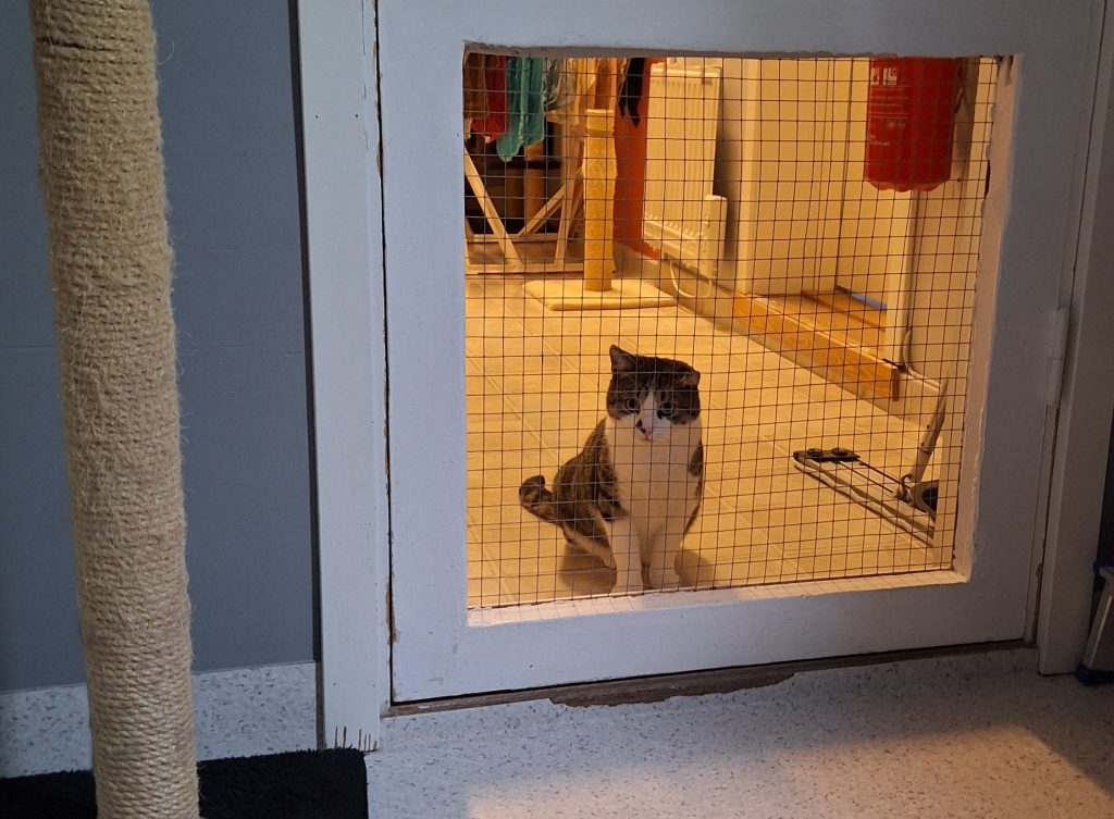 Totalt finns tillstånd för 25 katter. Flera är just nu ute i någon av de fem rastgårdarna. Gråtigrerade Sixten, som precis friskförklarats och fått komma ur karantänen, skramlar med en bjällerboll i karantänskorridoren. Då och då stannar han upp och tittar in på oss i köket.