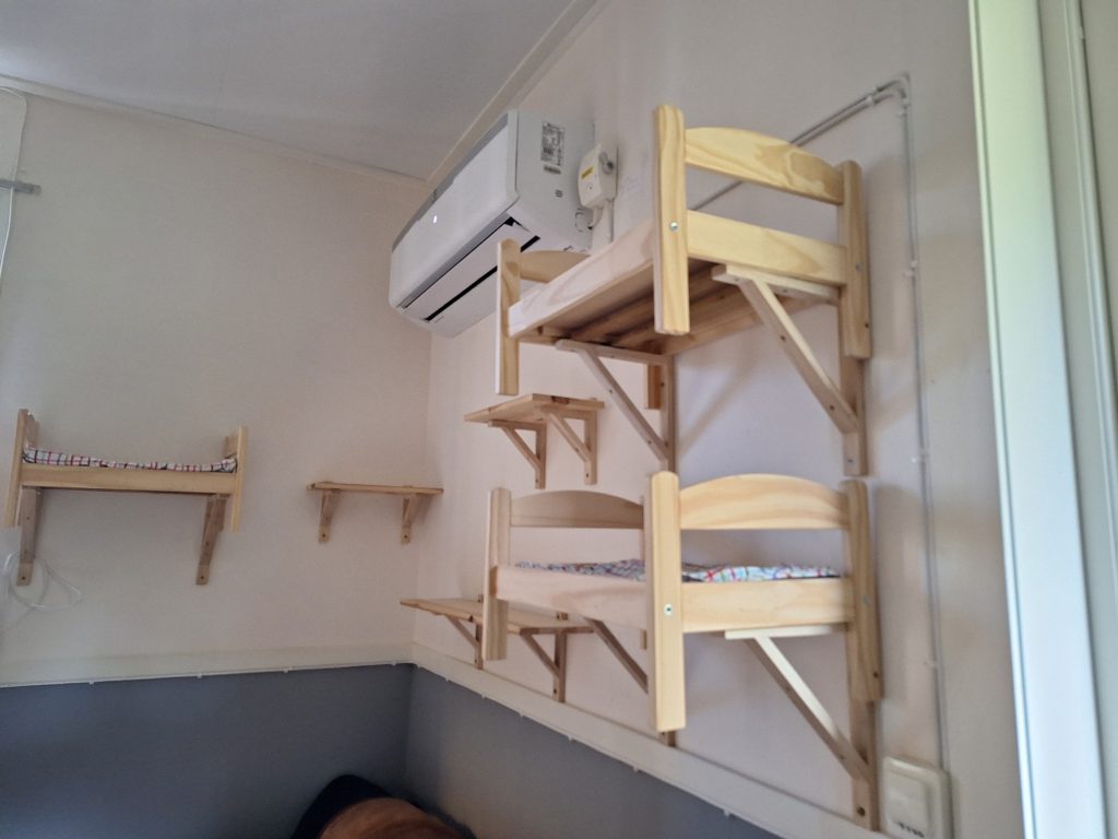 Nästa steg är att sitta inne i hytten. Katten får gärna hålla sig inne i sina krypin.