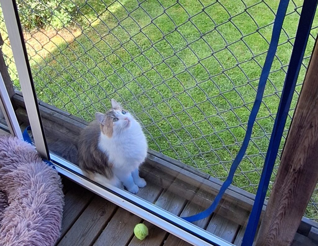 – Vi vet inte ännu hur han går ihop med andra katter så han får börja i korridoren. Men visst märks det att han vill ha sällskap? säger Helena Jonsson, djurhemsanvarig, och ler mot den lille katten på andra sidan nätet, som fortsätter jaga sin boll.