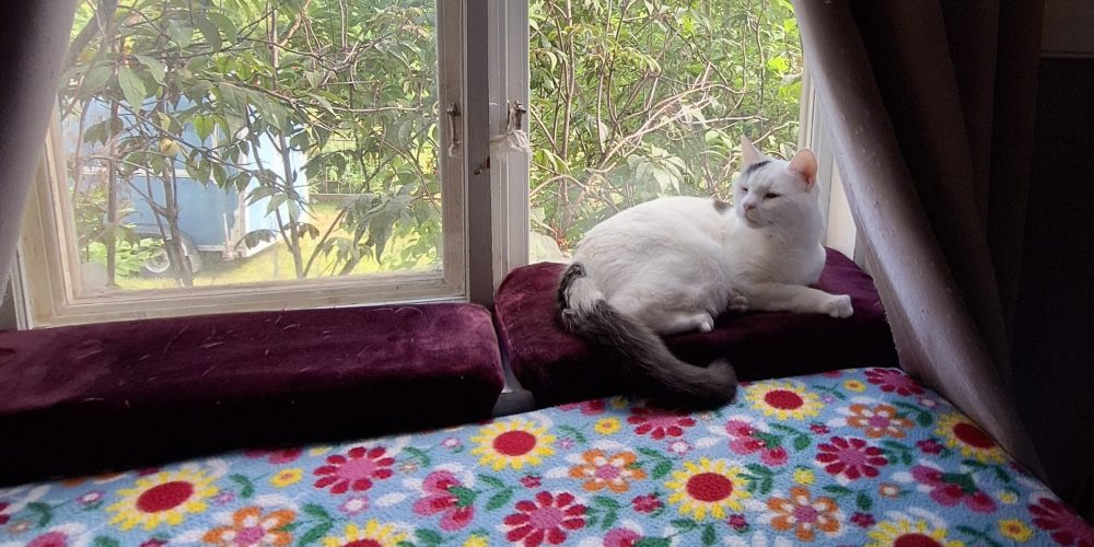Utanför köksfönstret sänker sig eftermiddagssolen. Loke kliver in i sin lilla tygigloo på soffan. Sixten har slutat skramla. Vilostunden på katthemmet kan börja.