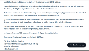 I informationen till ett annat halsband beskrevs hur hundägaren ”alltid har kontrollen”. Hunden kommer ”aldrig att vänja sig vid ljudet/vibrationen då antibarkkragen väljer olika kombinationer”.
